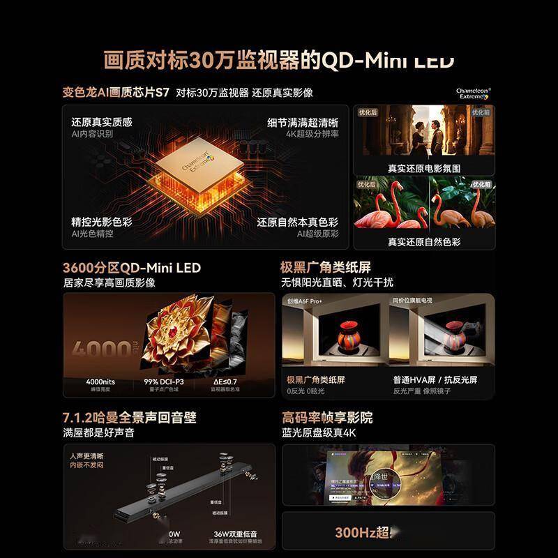 创维电视A6F Pro+的核心竞争力在于其精密的分区控光技术。3600个独立控光区域如同微型探照灯,能够精准调节每一寸屏幕的亮度。观看《星际穿越》时,黑洞周围的星云层次分明;播放《权力的游戏》夜战场景,暗部细节纤毫毕现,彻底告别传统电视的“灰蒙蒙”现象。